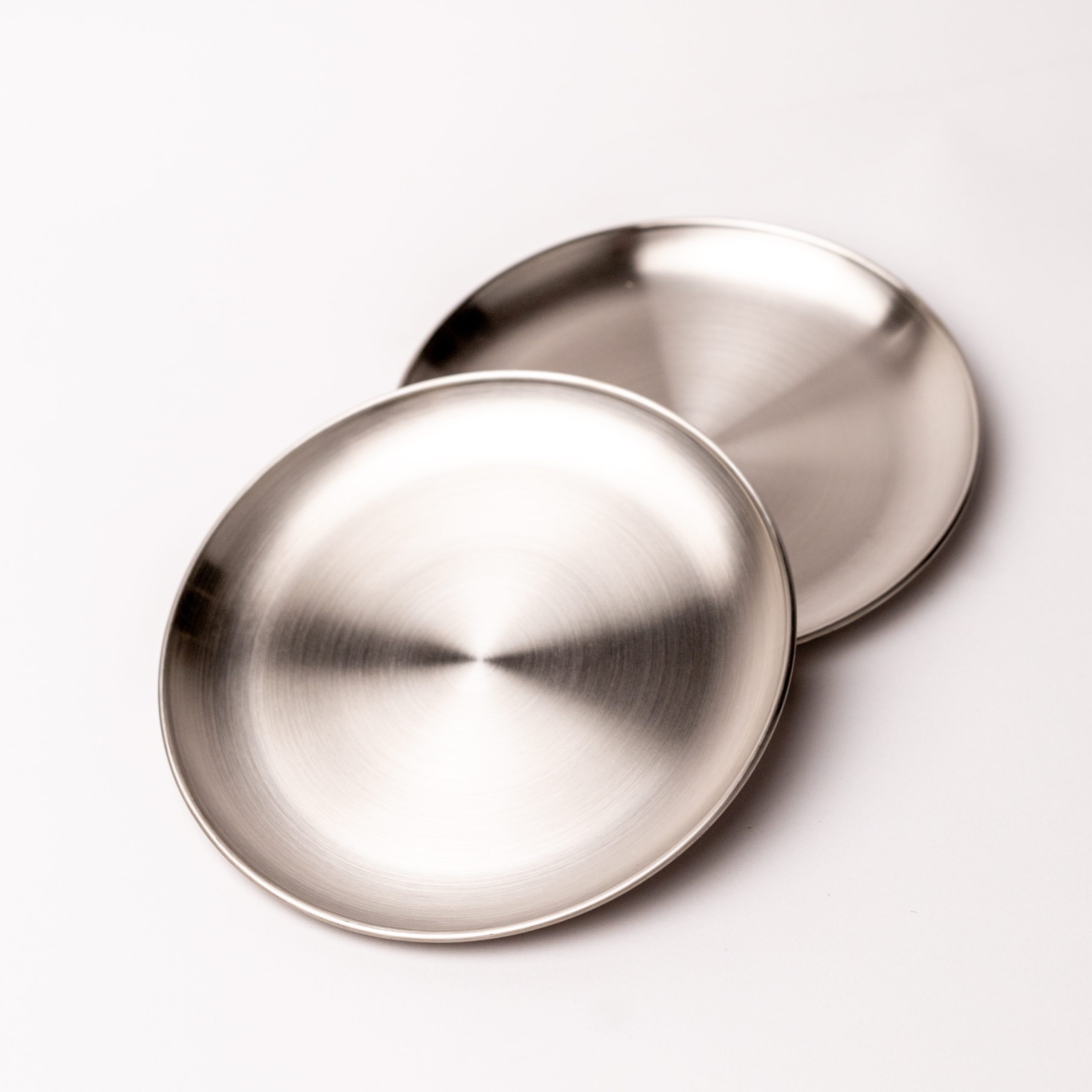 Set of 2 stainless steel plate made of SUS304 material with 19.5 cm diameter. It can be an attractive element of the full accessory kit. Easy to clean and pack.
