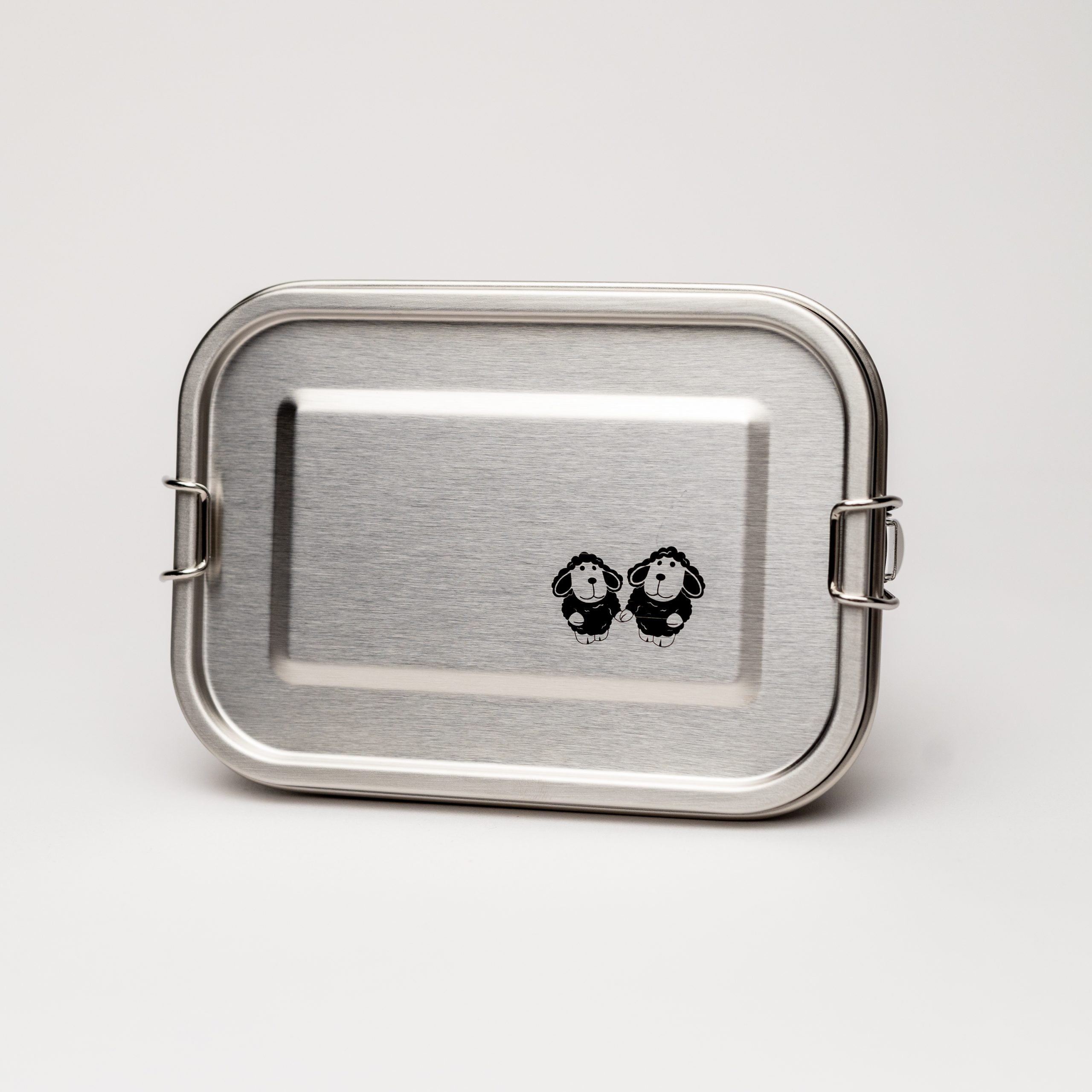 Tetszetős, rozsdamentes acél uzsonnás doboz, fém tetővel és logóval, amely kiválóan alkalmas piknik, vagy túrázáshoz csomagolt ételek szállítására.