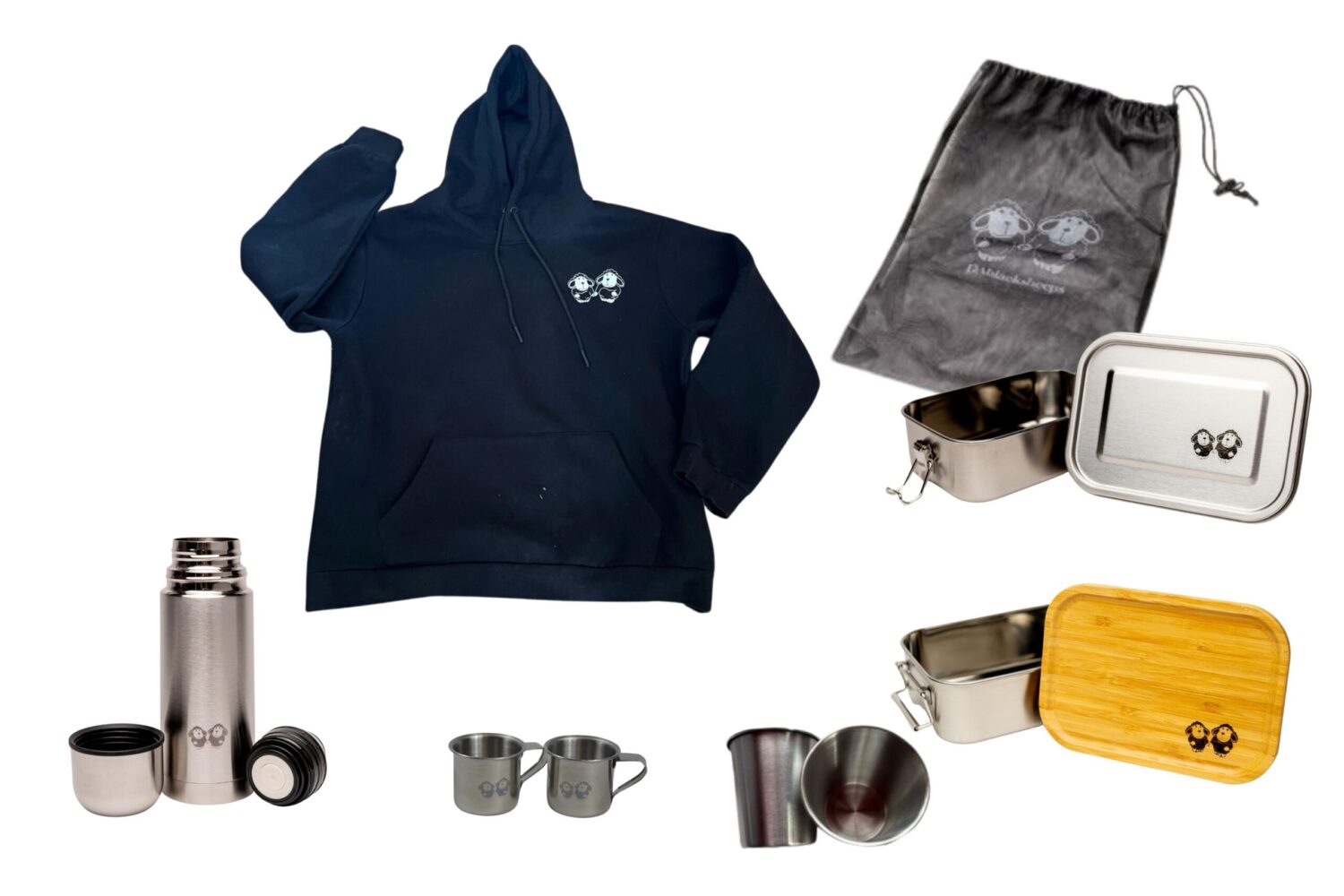 A kapucnis pulóver, uzsonnás dobozok, a termosz és kávéscsészék DAblacksheeps logóval.